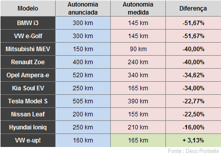 A deco fez um ensaio a 10 veículos 100% eléctricos e testou a autonomia comparando os valores obtidos com os valores anunciados. Os resultados surpreendem pelas discrepâncias entre o anunciado e o medido pela equipa da Deco Proteste. Apenas o VW e-up! supera as espectativas, os restantes não atingem o valor anunciado. E em alguns casos a diferença é bastante assinalável. Os modelos testados: BMW i3, VW e-Golf, Mitsubishi MiEV, Renault Zoe, Opel Ampera-e, Kia Soul EV, Tesla Model S, Nissan Leaf, Hyundai Ioniq e VW e-up!.